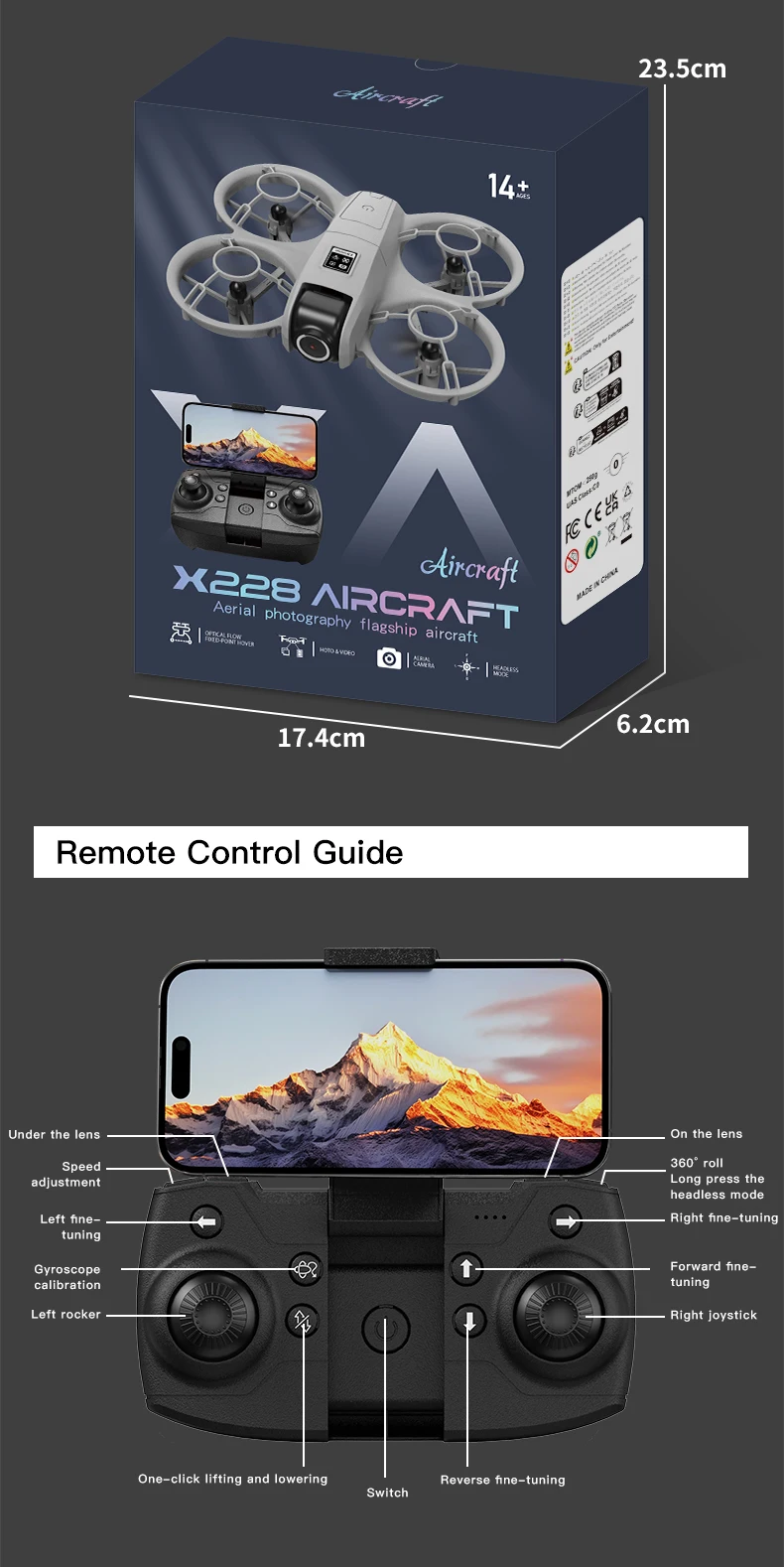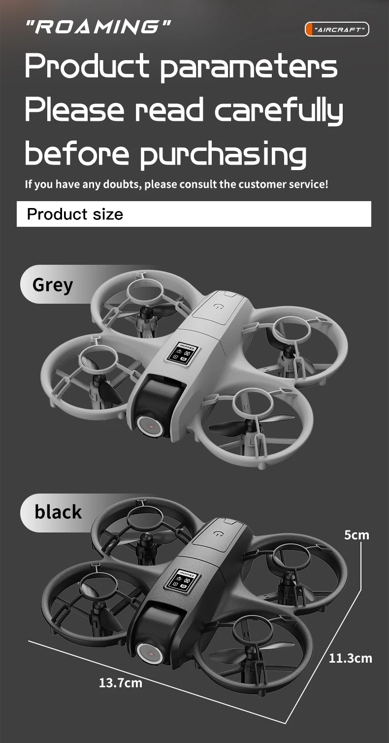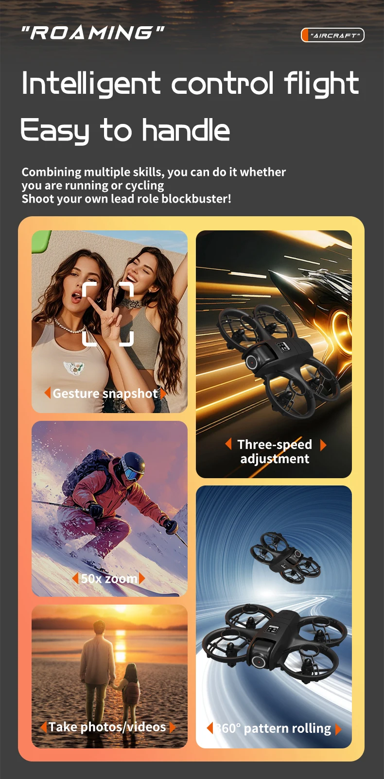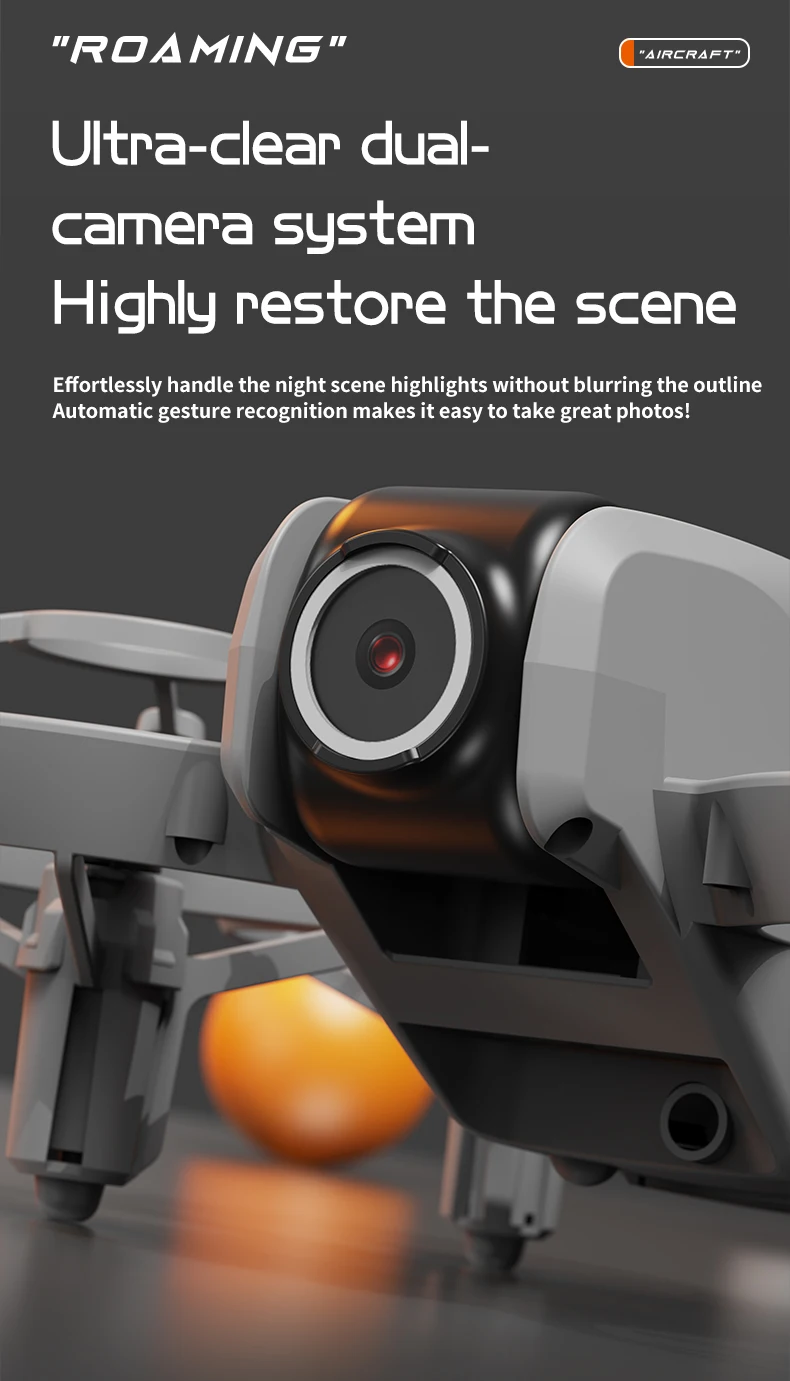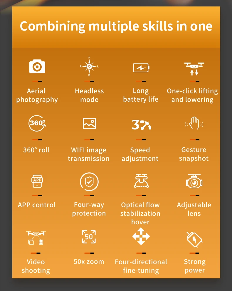 «Cámara ajustable, conmutación entre cámaras duales, vuelo estacionario con flujo óptico, despegue/aterrizaje con un solo botón, rotación de 360°, zoom de 50x, grabación de fotos y videos, ajuste fino de cuatro direcciones, diseño totalmente protector, interruptor de tres velocidades, modo sin cabeza.»